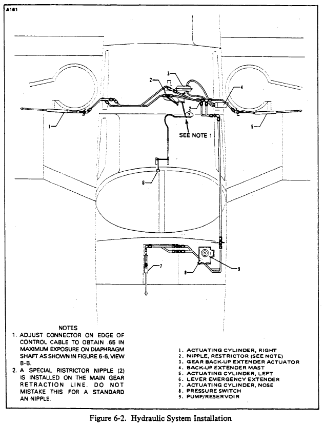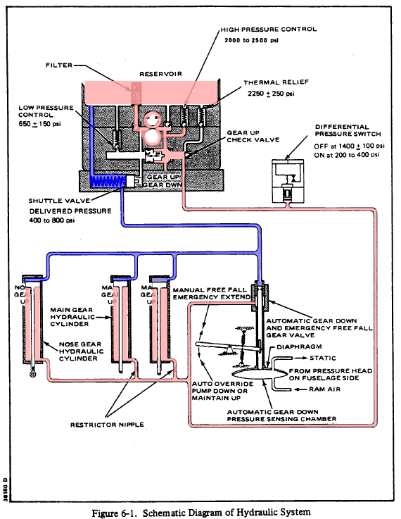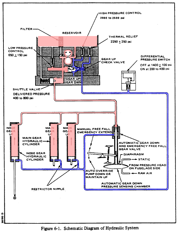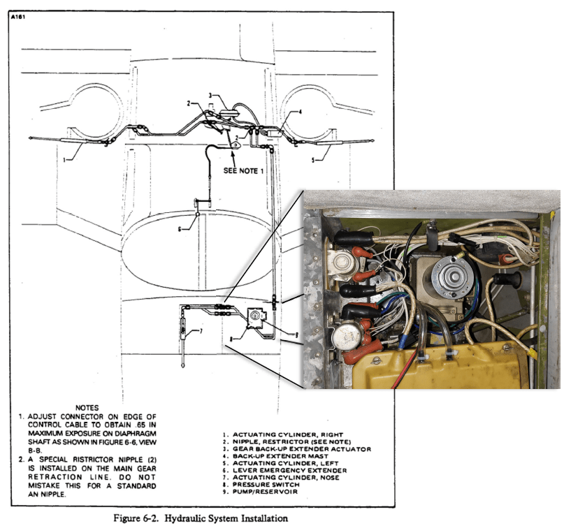 Here are the they hydraulic schematics in the gear up and gear down positions side-by-side for comparison.