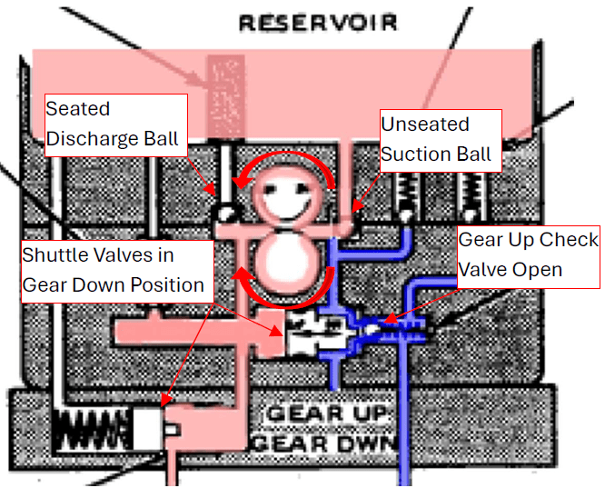The shuttle valve below the pump is forced to the gear down position by the pump pressure and the pressure also opens this gear up check valve which allows the pump to pressurize the gear up side of the system. This shuttle valve has an extrusion that opens the Gear Up Check Valve which open the flow path for fluid from the hydraulic actuators on each gear to return to the hydraulic reservoir. This depressurizes the gear up side of the landing gear actuators and gear extension begins because of the spring loading on the gear.